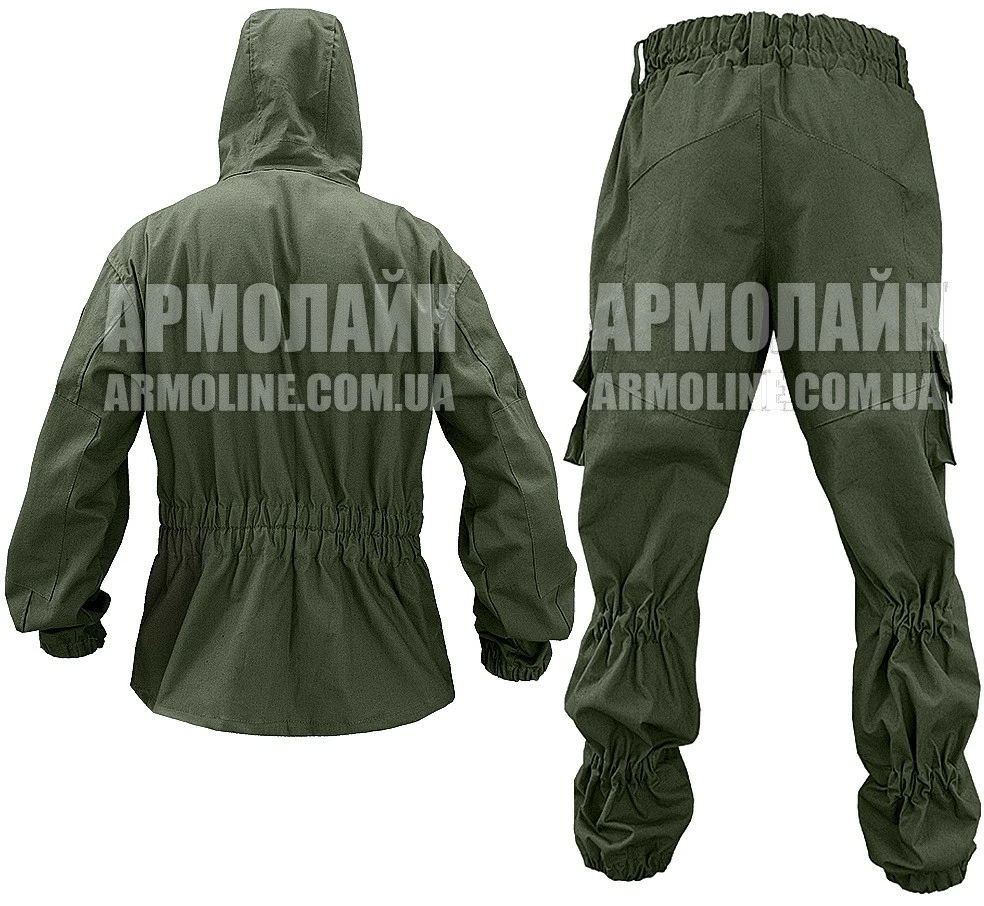 Для лучшей посадки, прилегания и во избежание «парусения» на ветру костюм имеет систему стяжек на основе резинотканевой тесьмы: на куртке ― по талии спины и низу рукавов; на брюках ― пояс, голень в 2-х местах и низ.