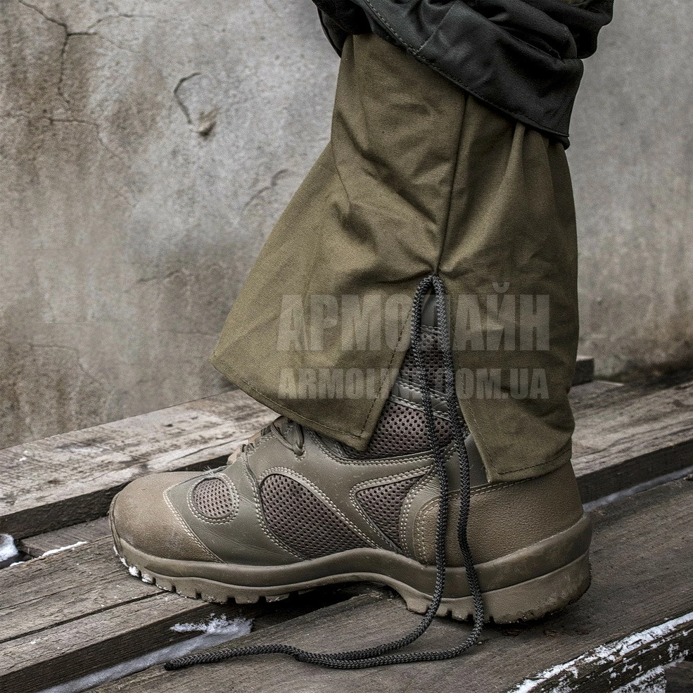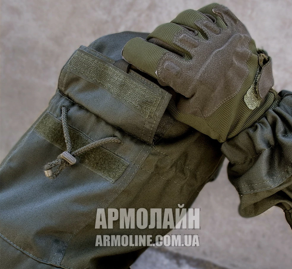 Штаны ― с эластичным поясом и утяжным шнуром, на ленточных пуговицах, 6 ― карманов, колени и задняя часть двухслойные, усилены плотной прочной тканью Грета. В нижней части штанин ― подшит дополнительный слой ткани "пыльник" со шнуром. В районе сгиба ноги затяжка для более плотного прилегания и избежания парусения на ветру.