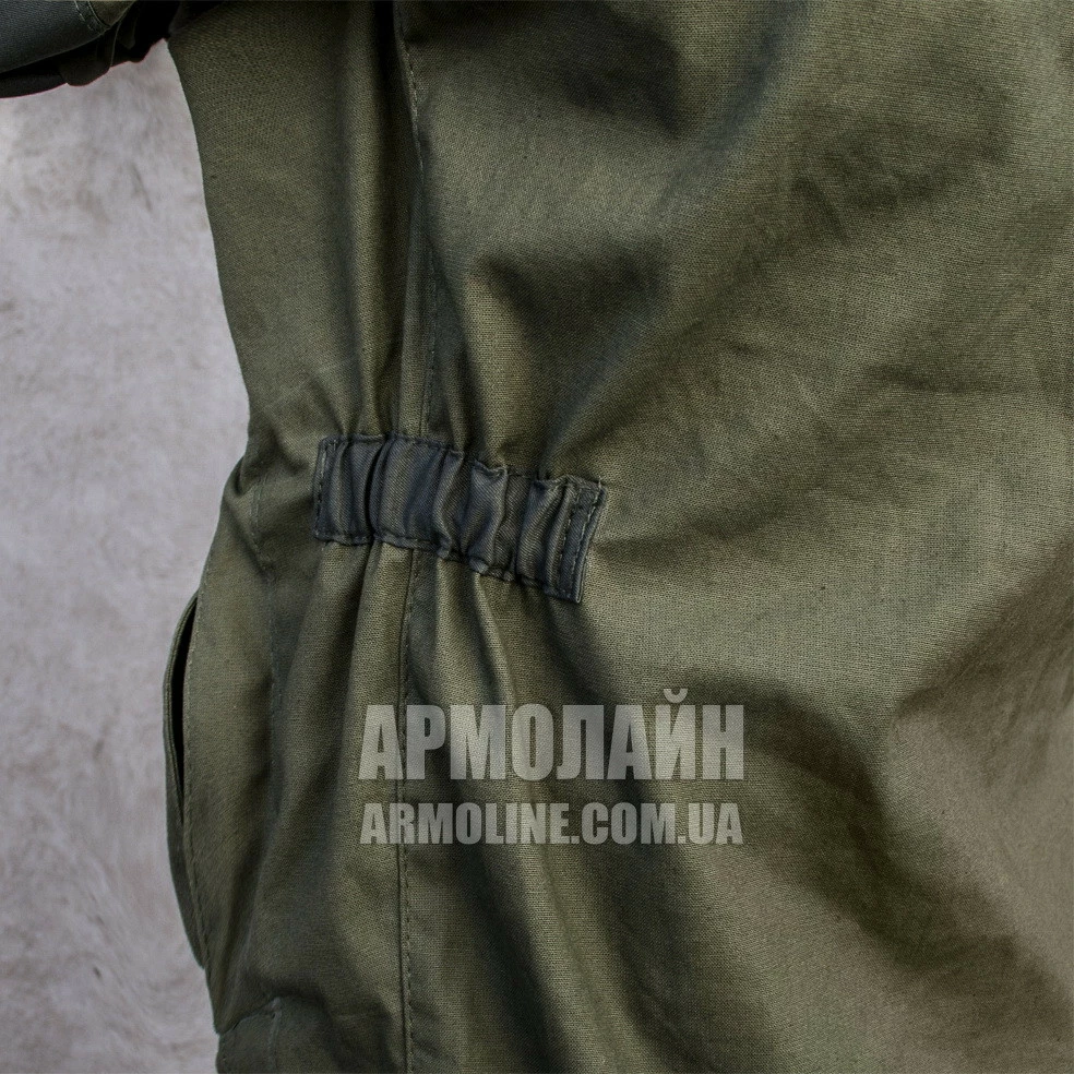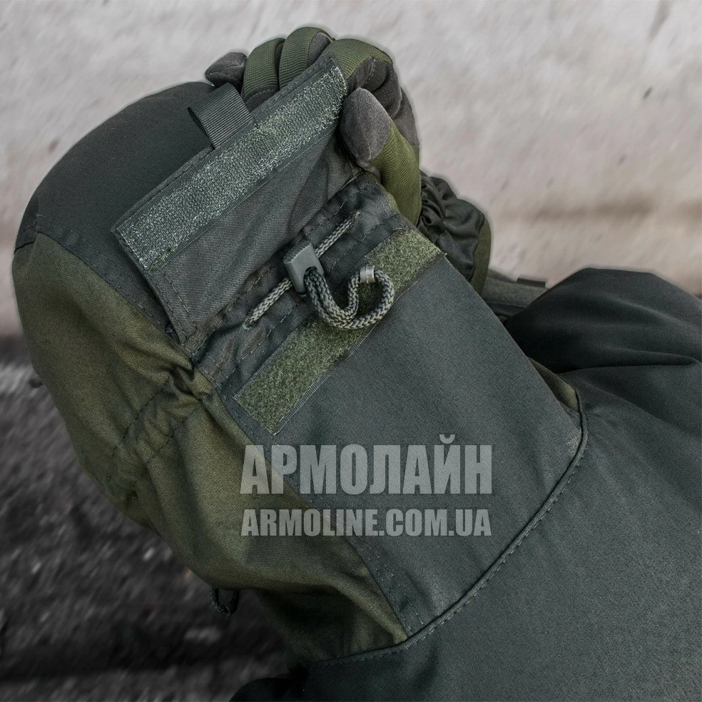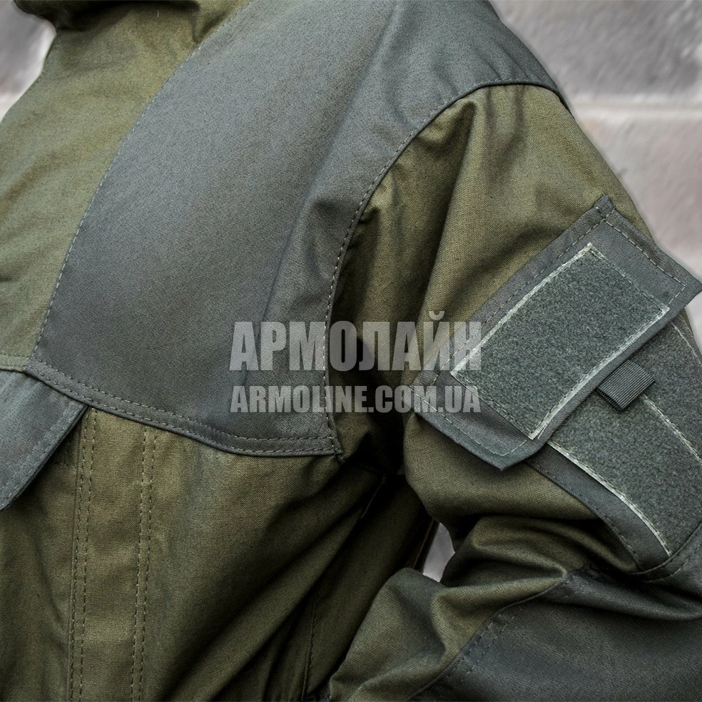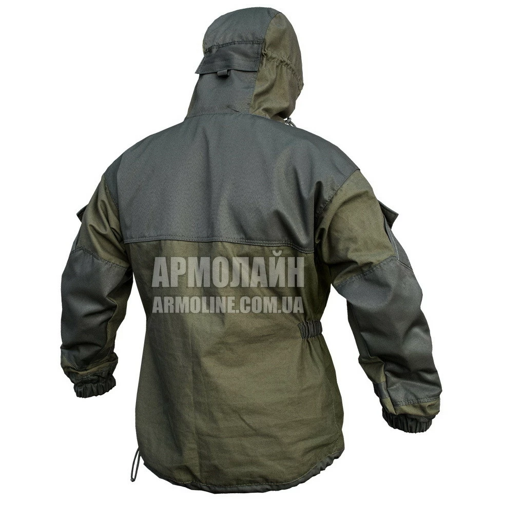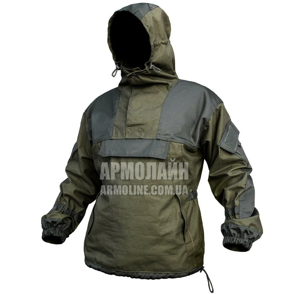 Куртка АНОРАК ― верх на ленточных пуговицах с капюшоном, 2 ― врезных (сквозных) кармана, 1 ― большой карман на пуговицах с клапаном на груди , плечи и локти двухслойные, усилены прочной плотной тканью Грета. Капюшон со стяжками и НАТОвскими фиксаторами, на затылке стяжка скрывается под клапаном во избежание зацепов. Поверх наплечных карманов нашито велкро для шевронов.