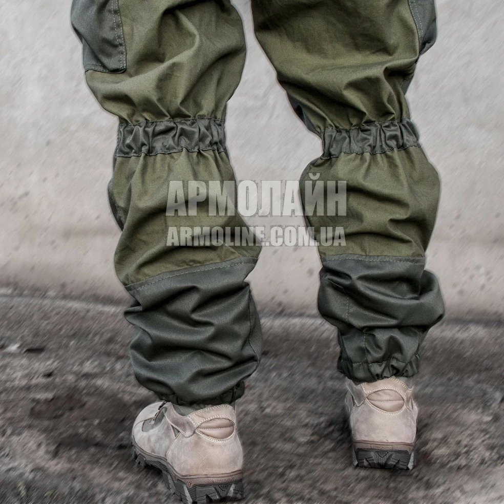 Штаны ― с эластичным поясом и утяжным шнуром, на ленточных пуговицах, 6 ― карманов, колени и задняя часть двухслойные, усилены плотной прочной тканью Грета. В нижней части штанин ― подшит дополнительный слой ткани "пыльник" со шнуром. В районе сгиба ноги затяжка для более плотного прилегания и избежания парусения на ветру.