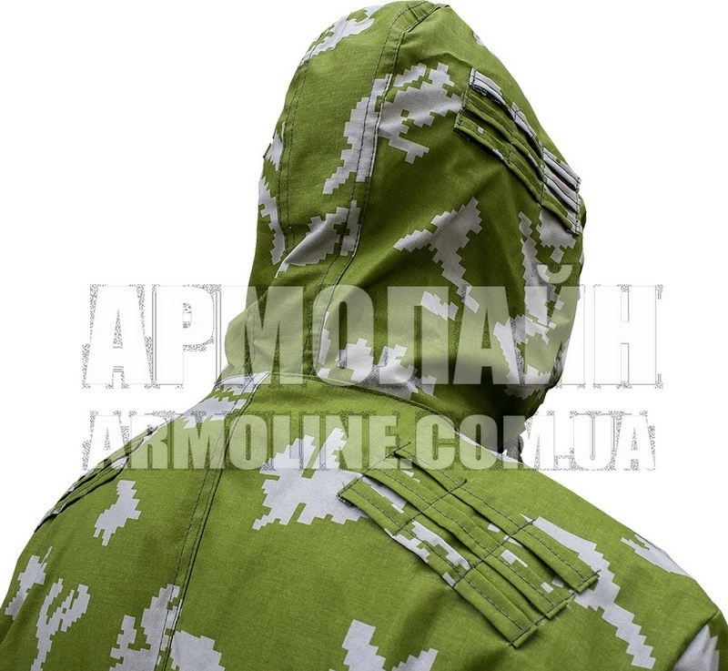 На спине, в районе лопаток, впереди на уровне ключиц, на капюшоне - нашиты петли для крепления растительности, для улучшения маскирующего эффекта.