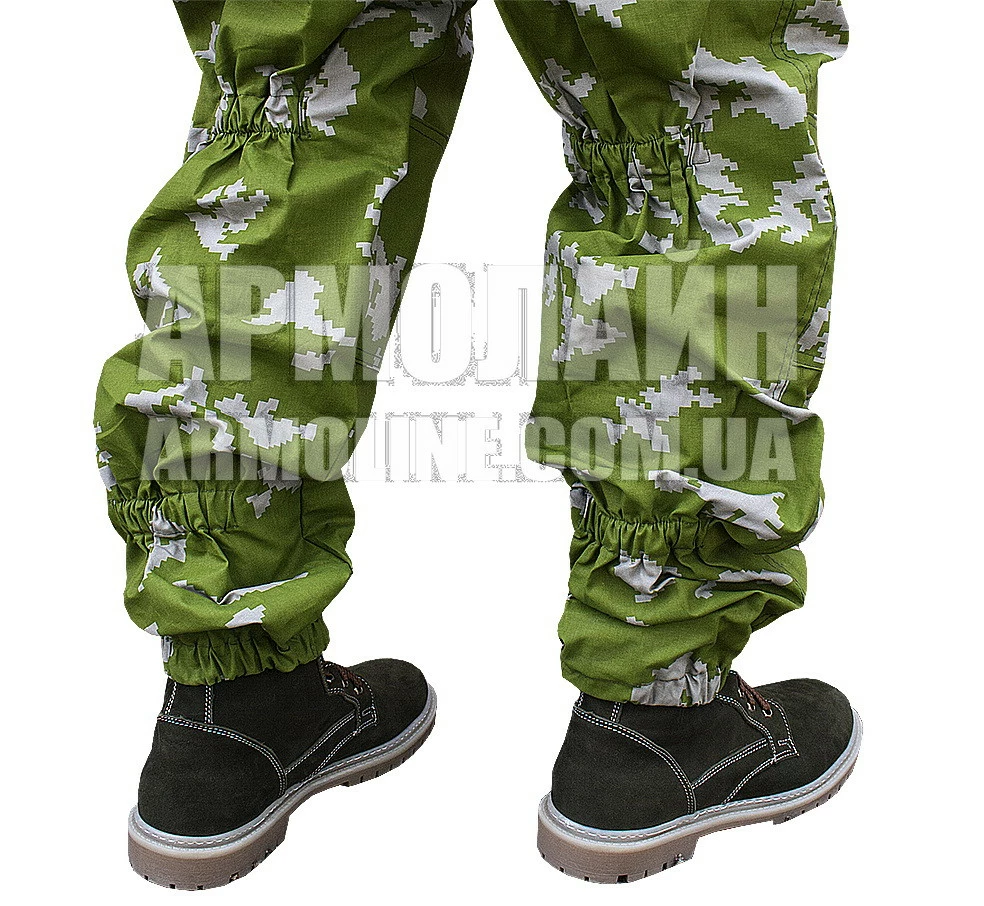 Брюки ― широкого кроя, пояс на резинке, регулируется при помощи шнура, есть шлёвки под широкий ремень, есть 2 накладных кармана, колени и задняя часть усилены дополнительным слоем ткани, низ брюк на резинке.