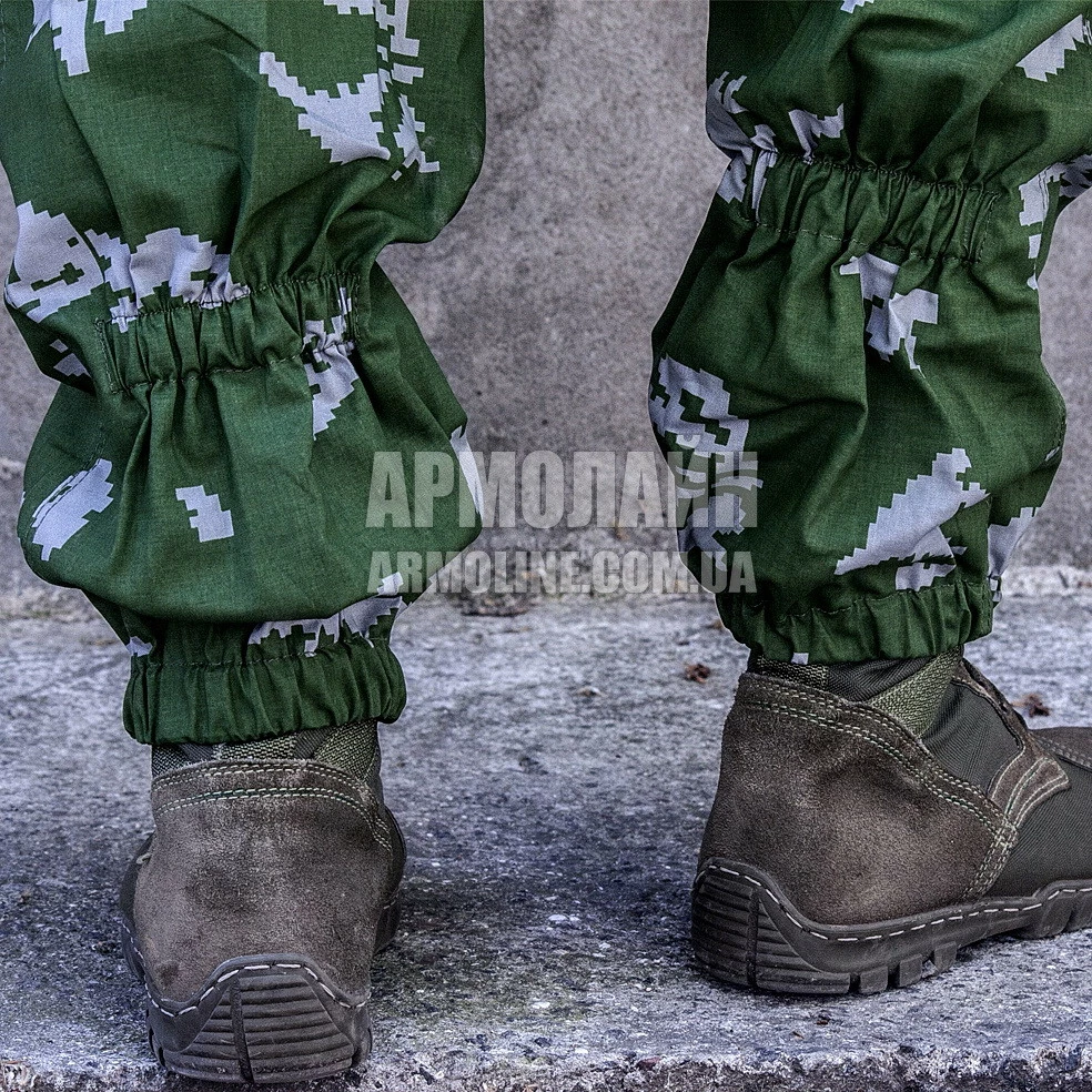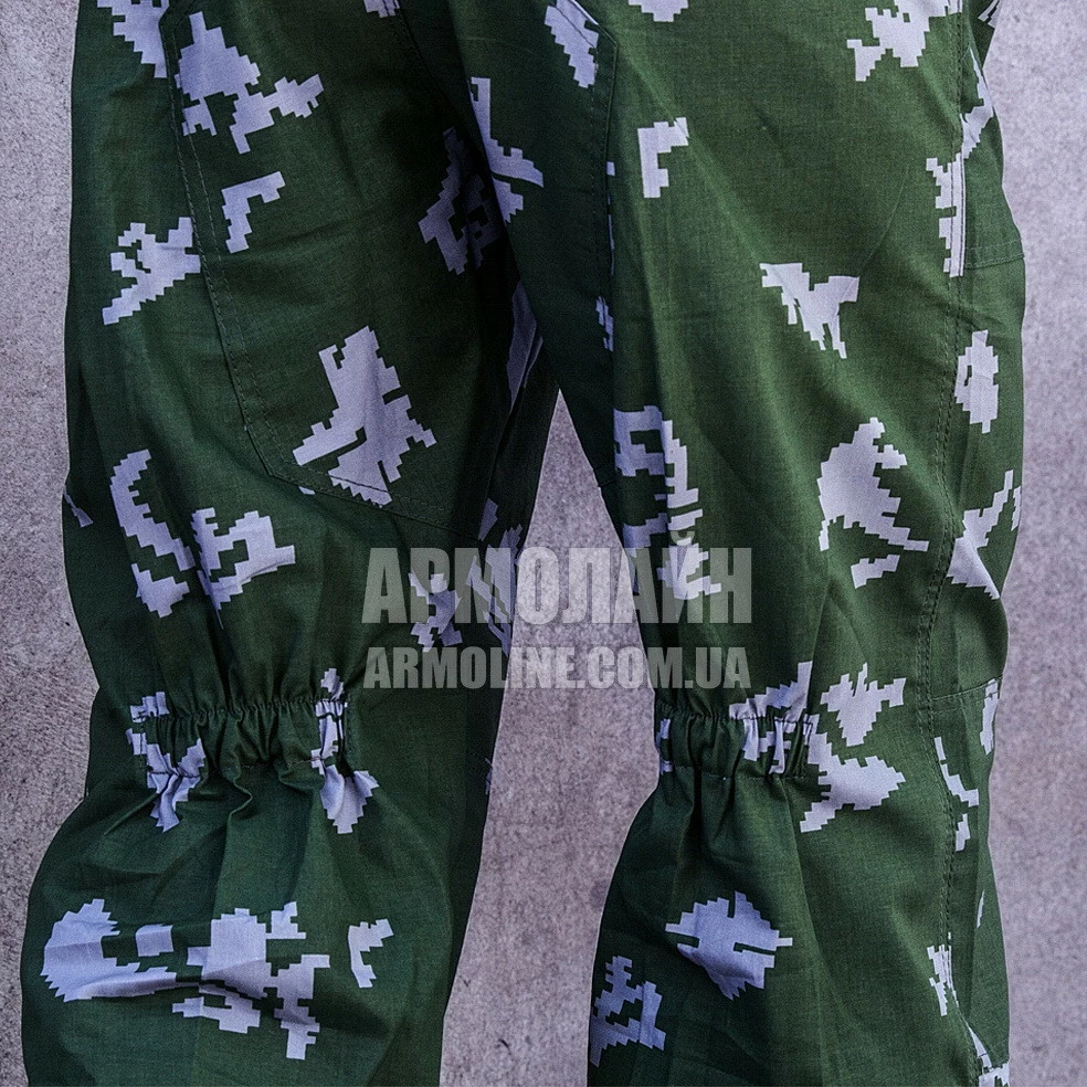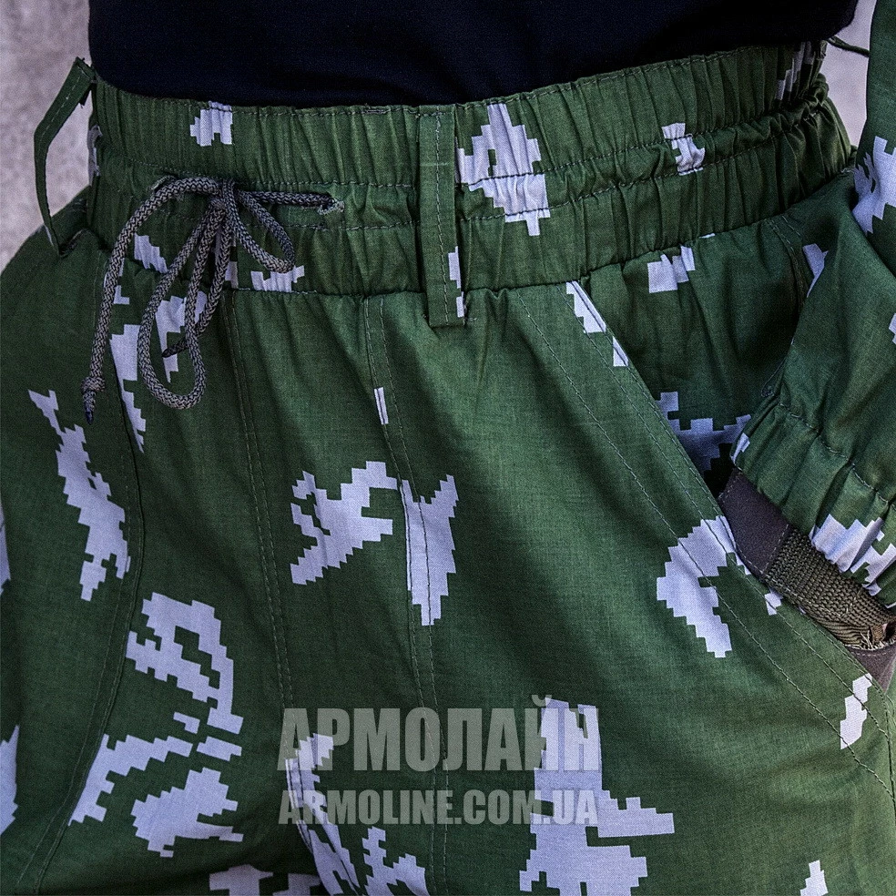 Брюки ― широкого кроя, пояс на резинке, регулируется при помощи шнура, есть шлёвки под широкий ремень, есть 2 накладных кармана, колени и задняя часть усилены дополнительным слоем ткани, низ брюк на резинке.