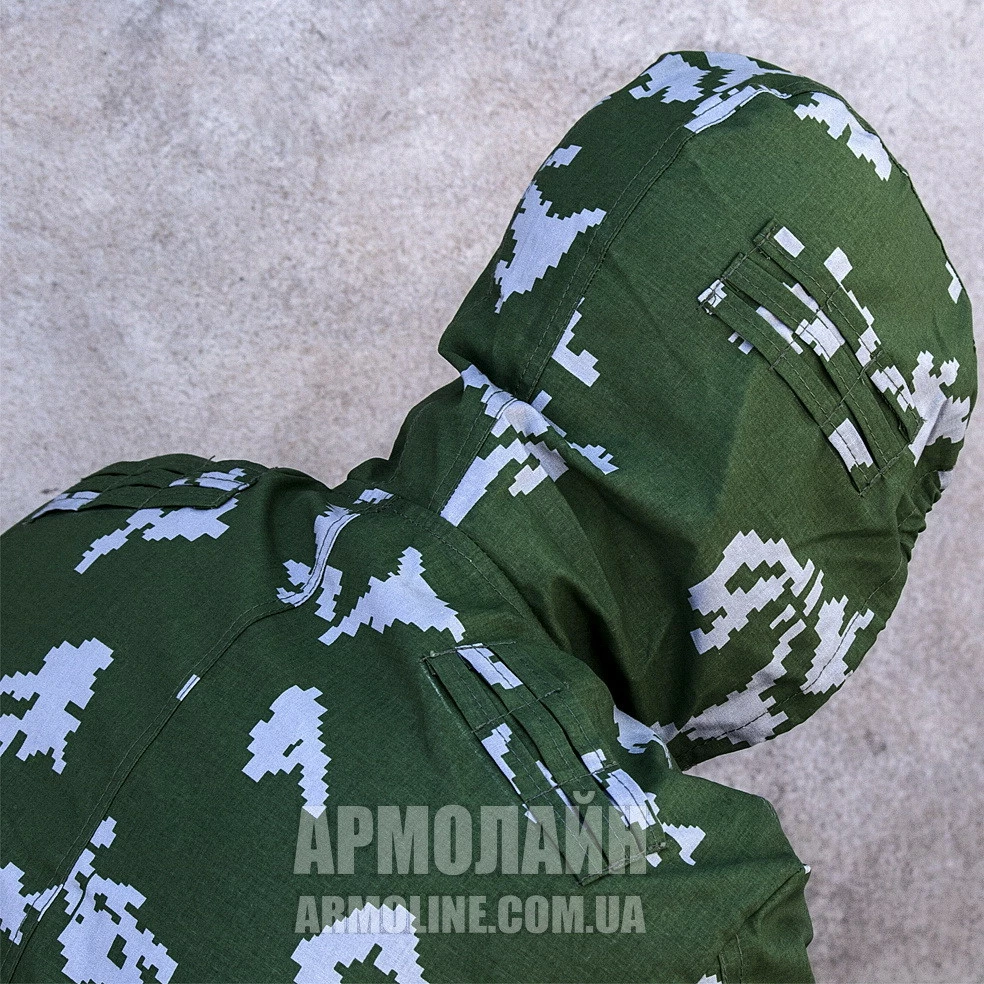 На спине в районе лопаток, впереди на уровне ключиц, на капюшоне нашиты петли для крепления растительности для улучшения маскирующего эффекта.