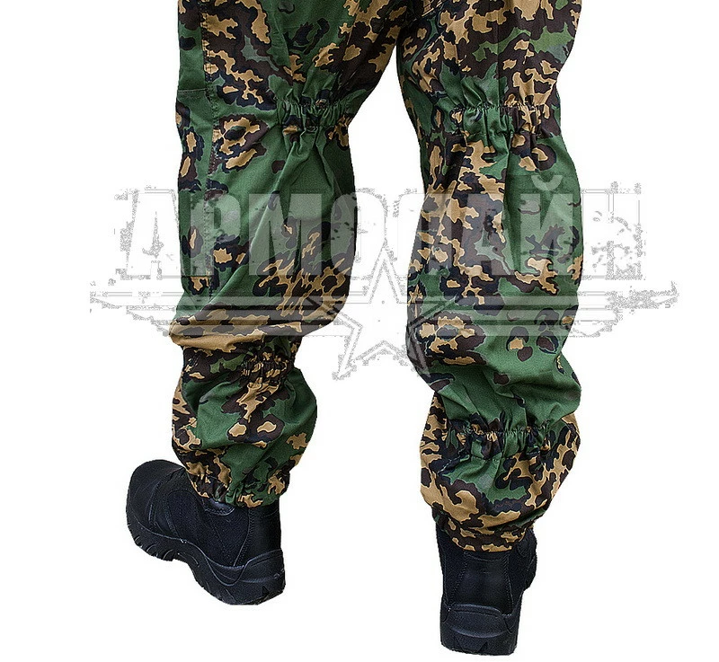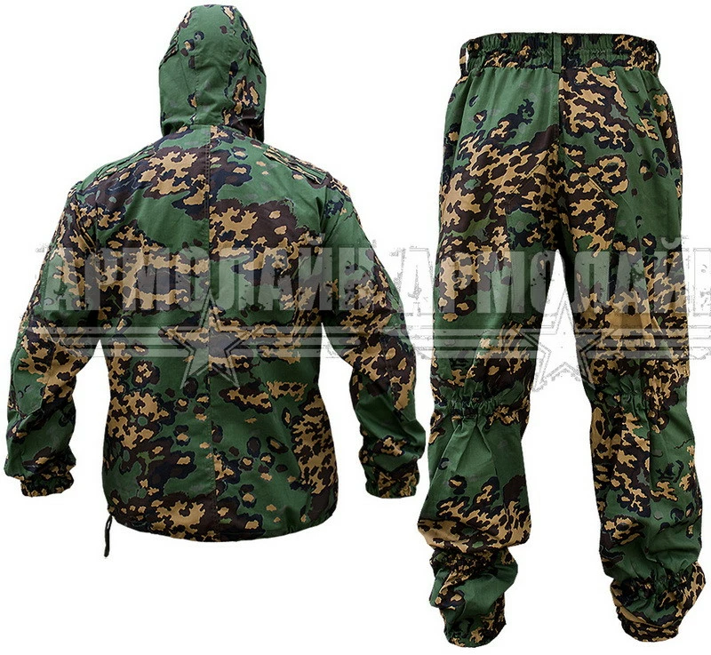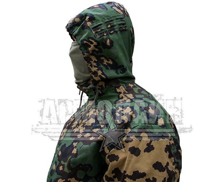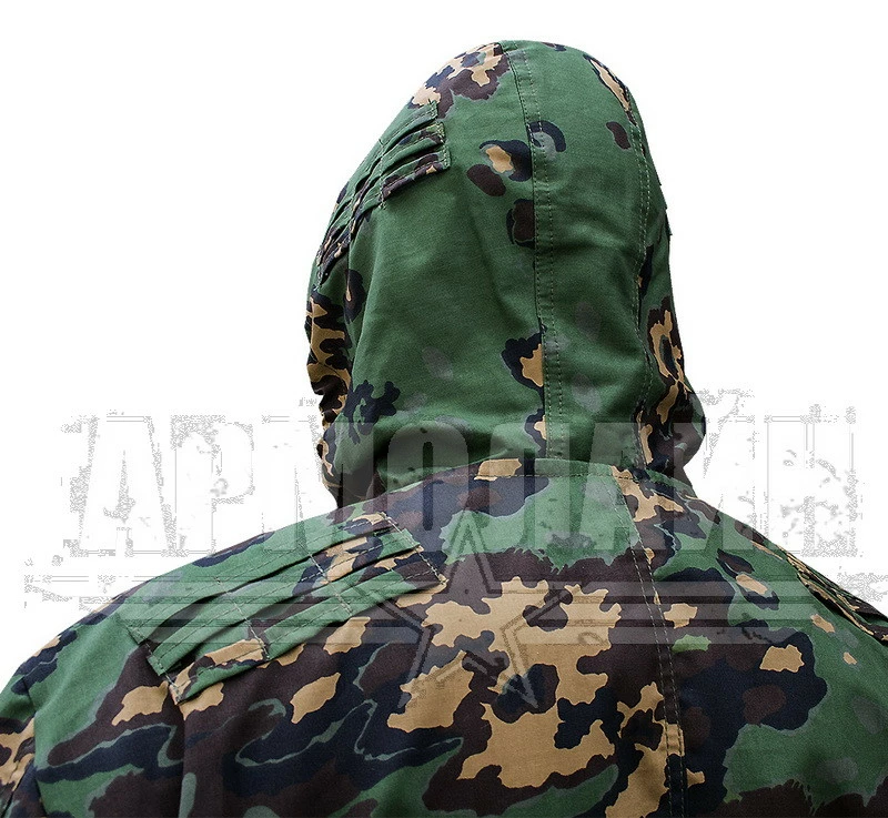 На спине в районе лопаток, впереди на уровне ключиц, на капюшоне нашиты петли для крепления растительности для улучшения маскирующего эффекта.