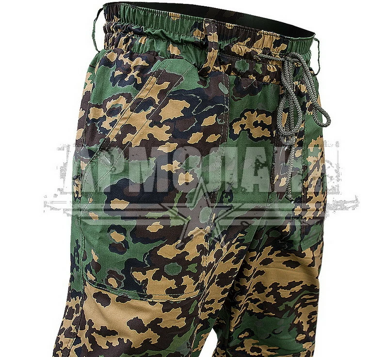 Брюки ― широкого кроя, пояс на резинке, регулируется при помощи шнура, есть шлёвки под широкий ремень, есть 2 накладных кармана, колени и задняя часть усилены дополнительным слоем ткани, низ брюк на резинке.