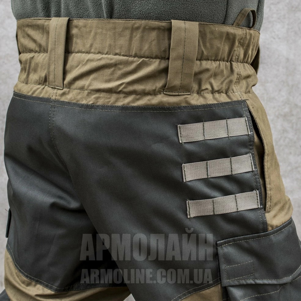 Вставки (накладки) - колени , низ штанин, и задняя часть, клапаны карманов двухслойные, усилены нейлоном. Задняя сторона, под коленом, стянута резиновым (обязательным) уплотнителем.